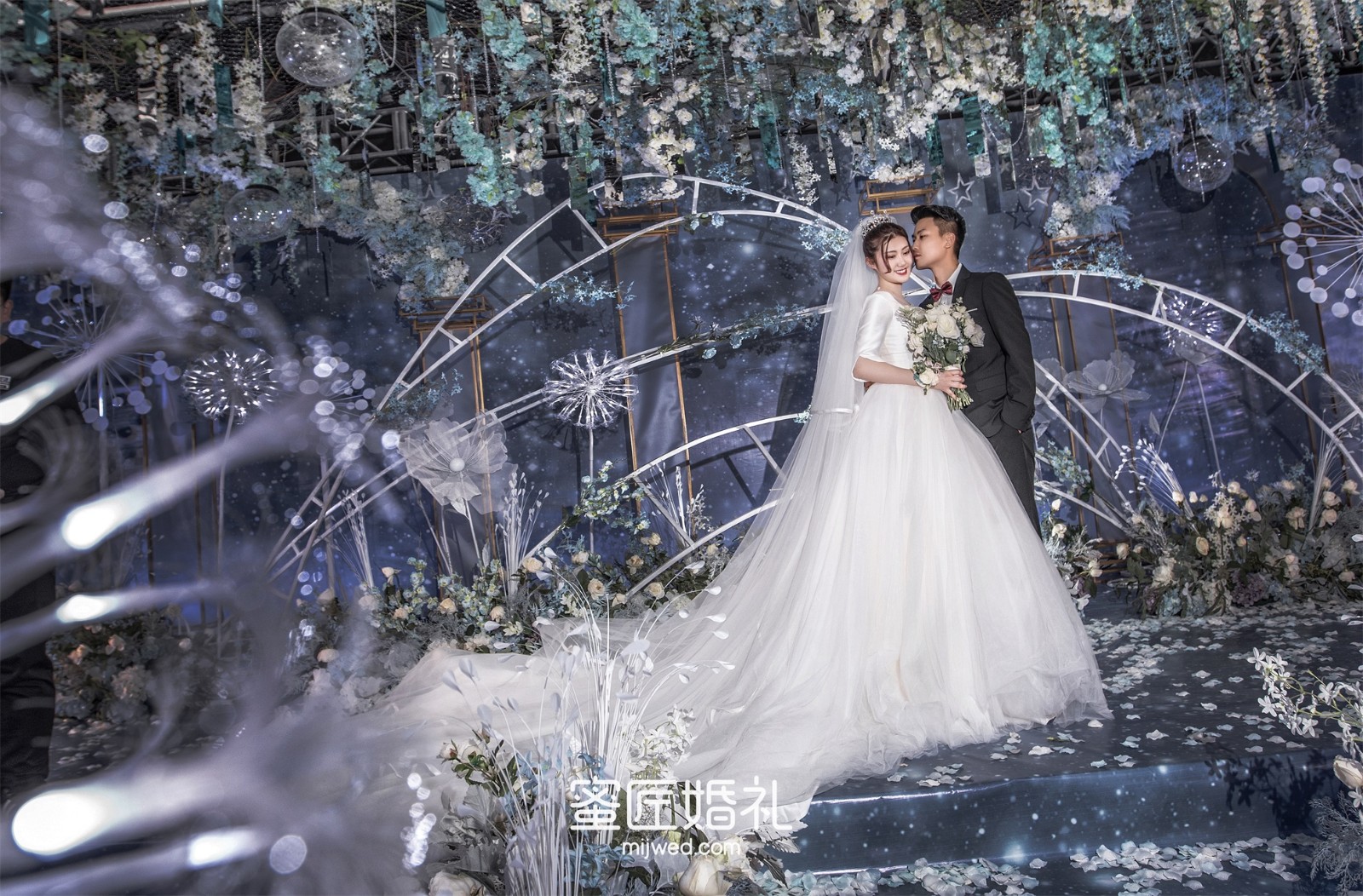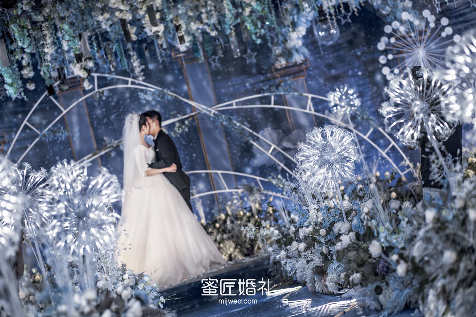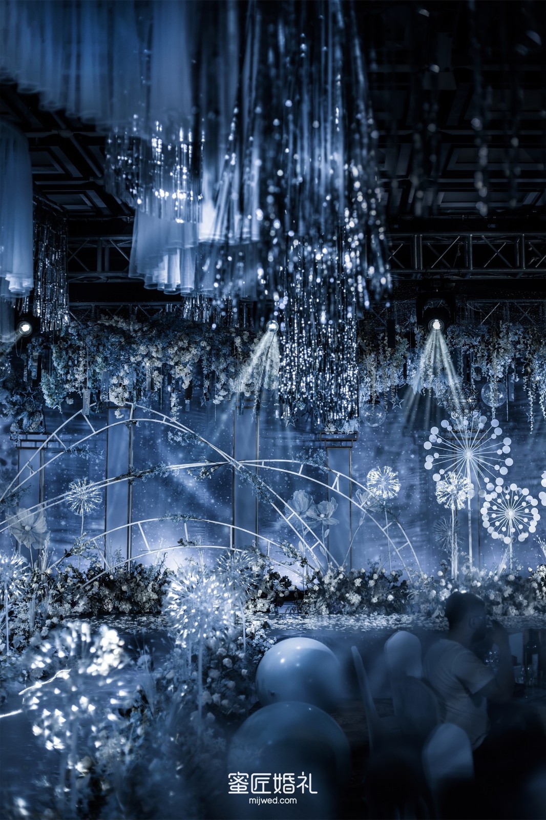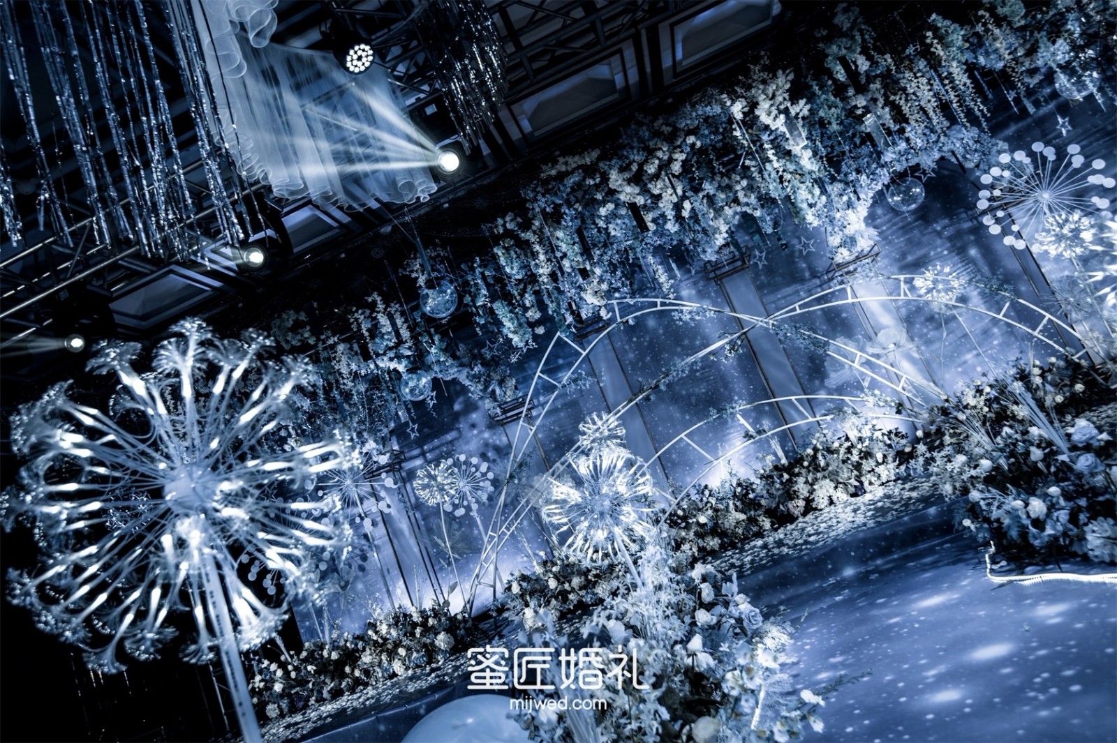 清透浪漫的水蓝色,Ins风蒲公英灯,大气浪漫的花艺顶,还有棉花糖一样的风车在光影中流转,在场宾客仿佛走进蓝色深海一般,我的婚礼现场比设计图还要震撼百倍!