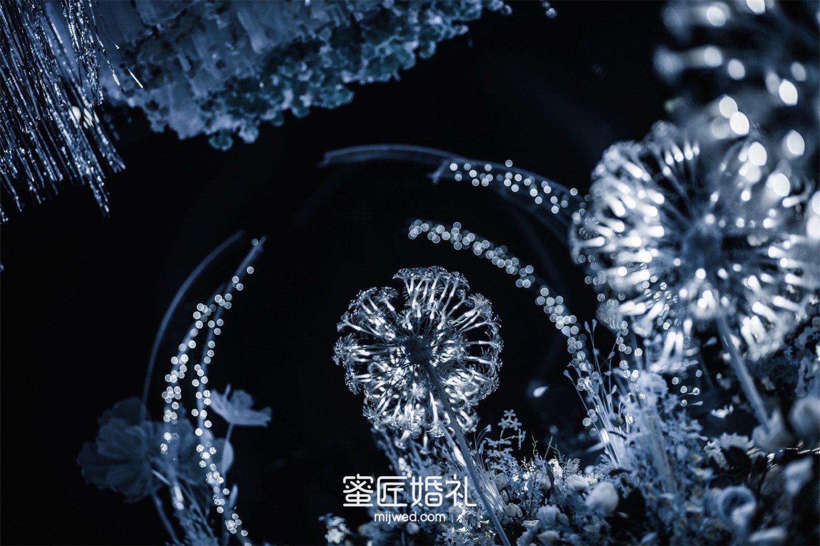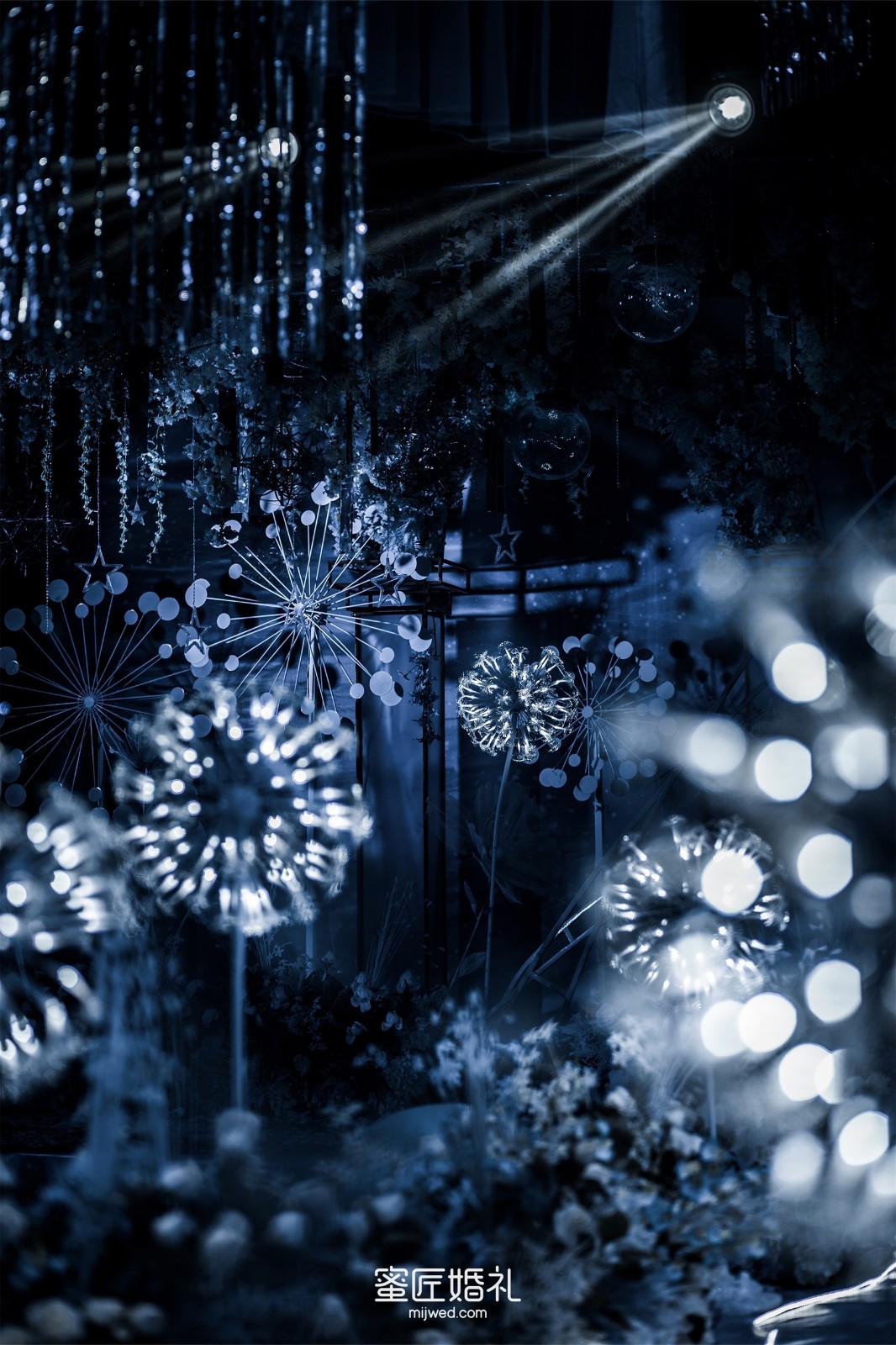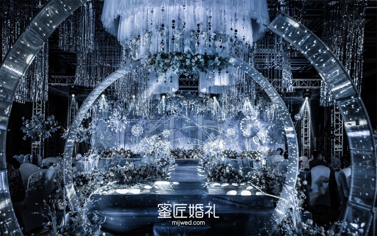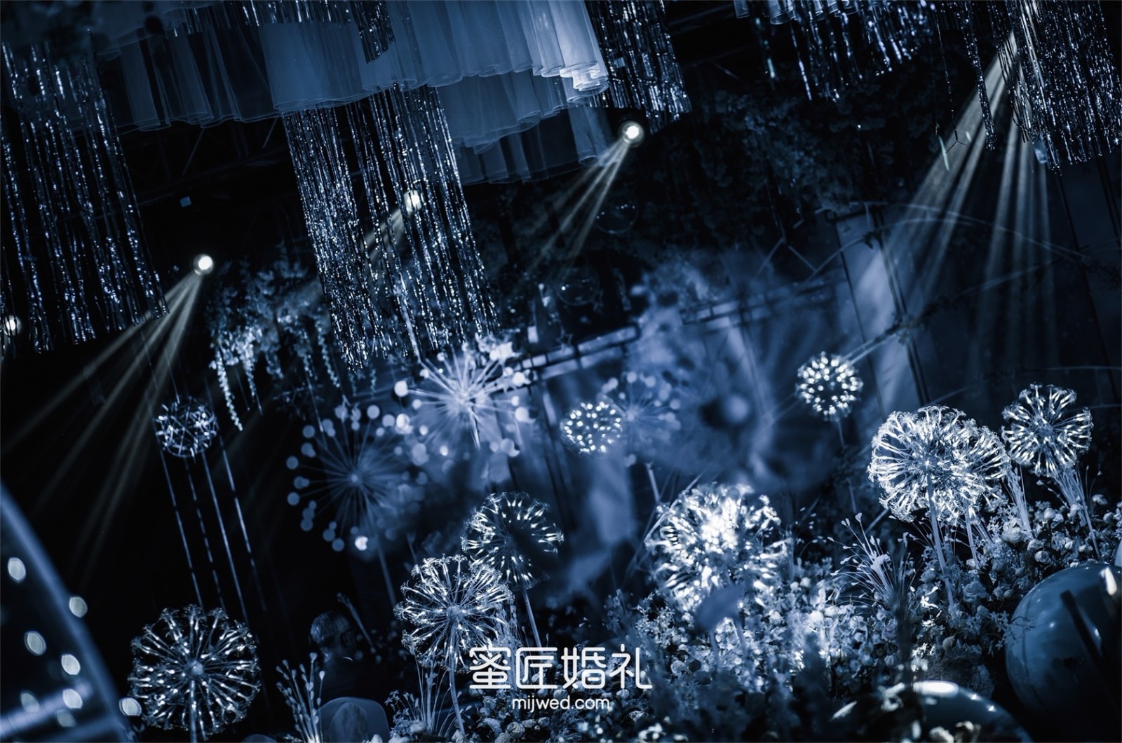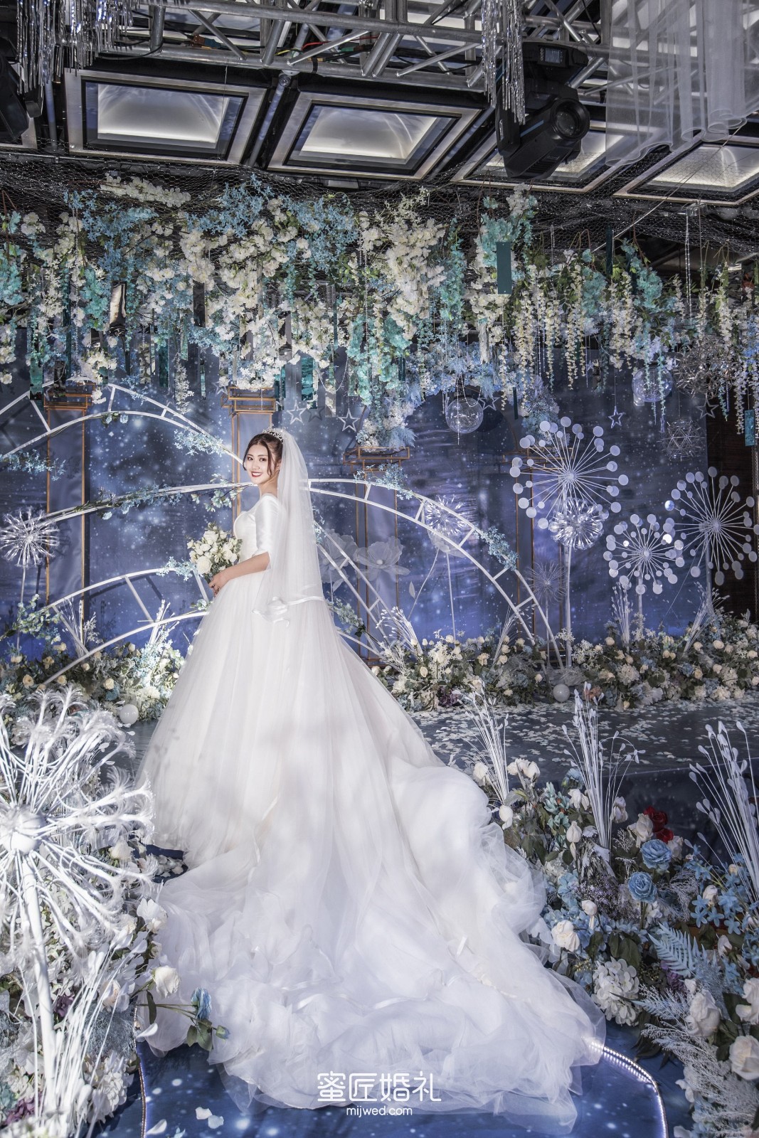 清透浪漫的水蓝色,Ins风蒲公英灯,大气浪漫的花艺顶,还有棉花糖一样的风车在光影中流转,在场宾客仿佛走进蓝色深海一般,我的婚礼现场比设计图还要震撼百倍!