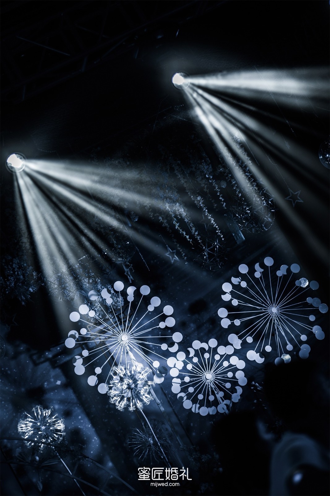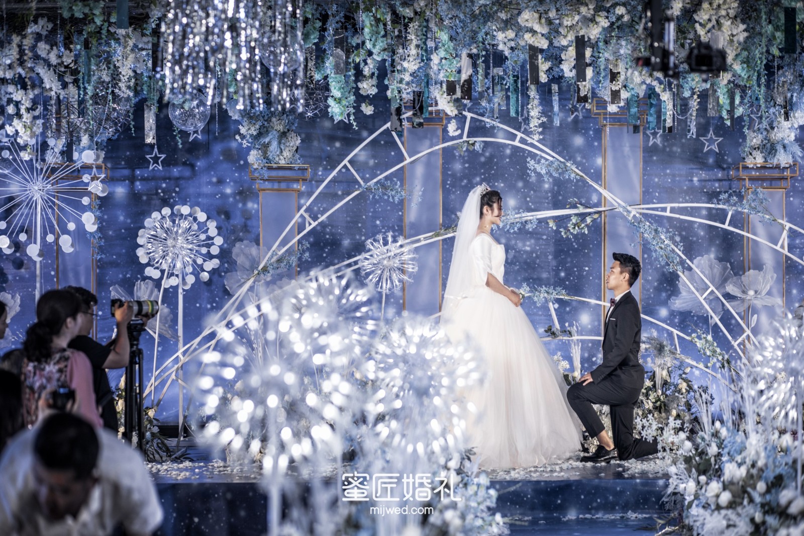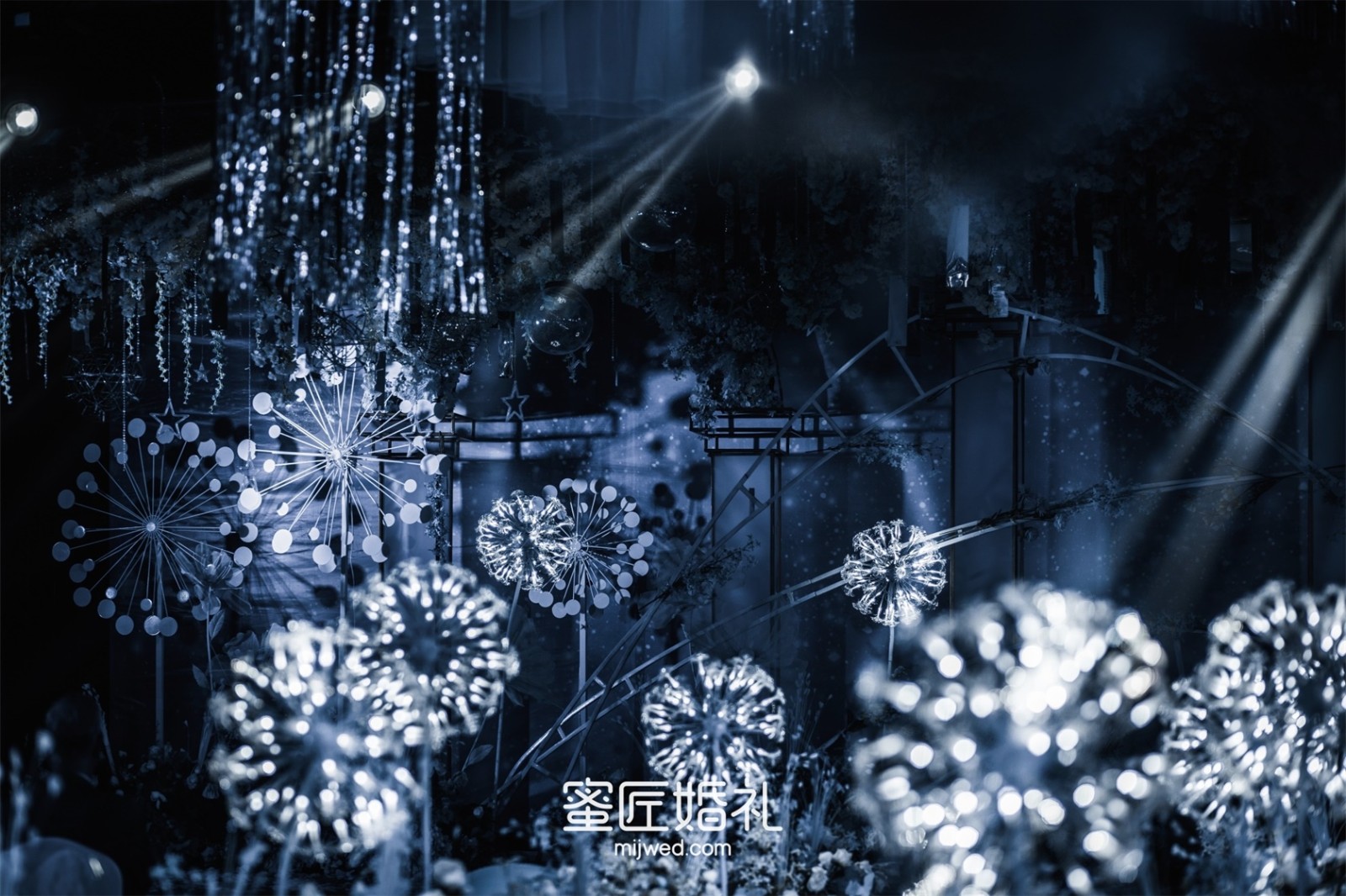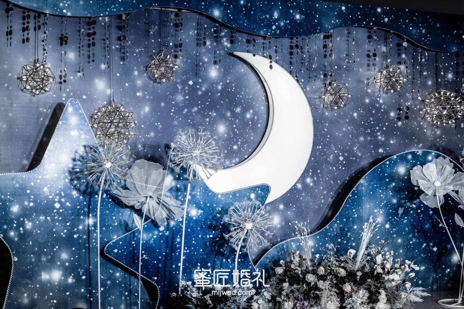 清透浪漫的水蓝色,Ins风蒲公英灯,大气浪漫的花艺顶,还有棉花糖一样的风车在光影中流转,在场宾客仿佛走进蓝色深海一般,我的婚礼现场比设计图还要震撼百倍!