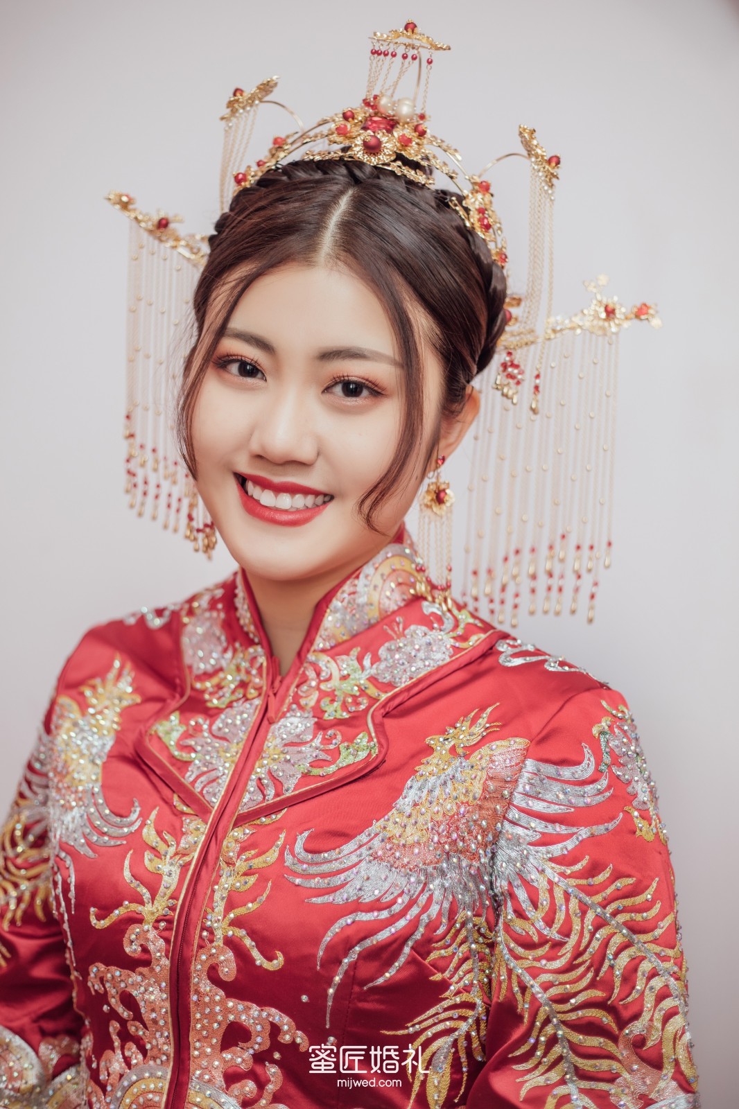 我个人不太适合特别华丽的婚纱,试了很多款后发现越简洁的我穿着越好看,较后选了上缎下纱的婚纱还特显瘦。出门的秀禾服也是在这家买的,很好看,拍照出来效果超级棒。