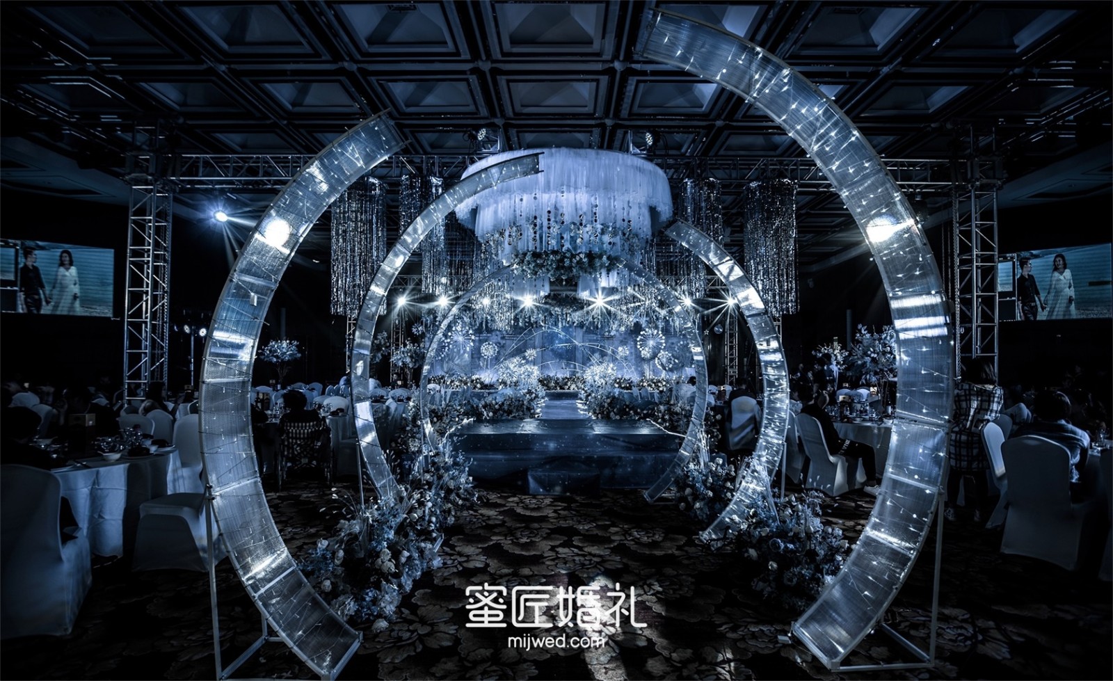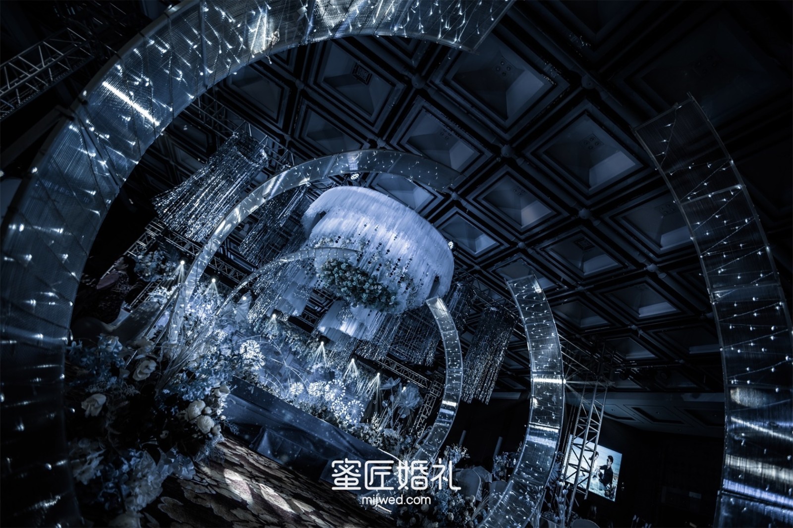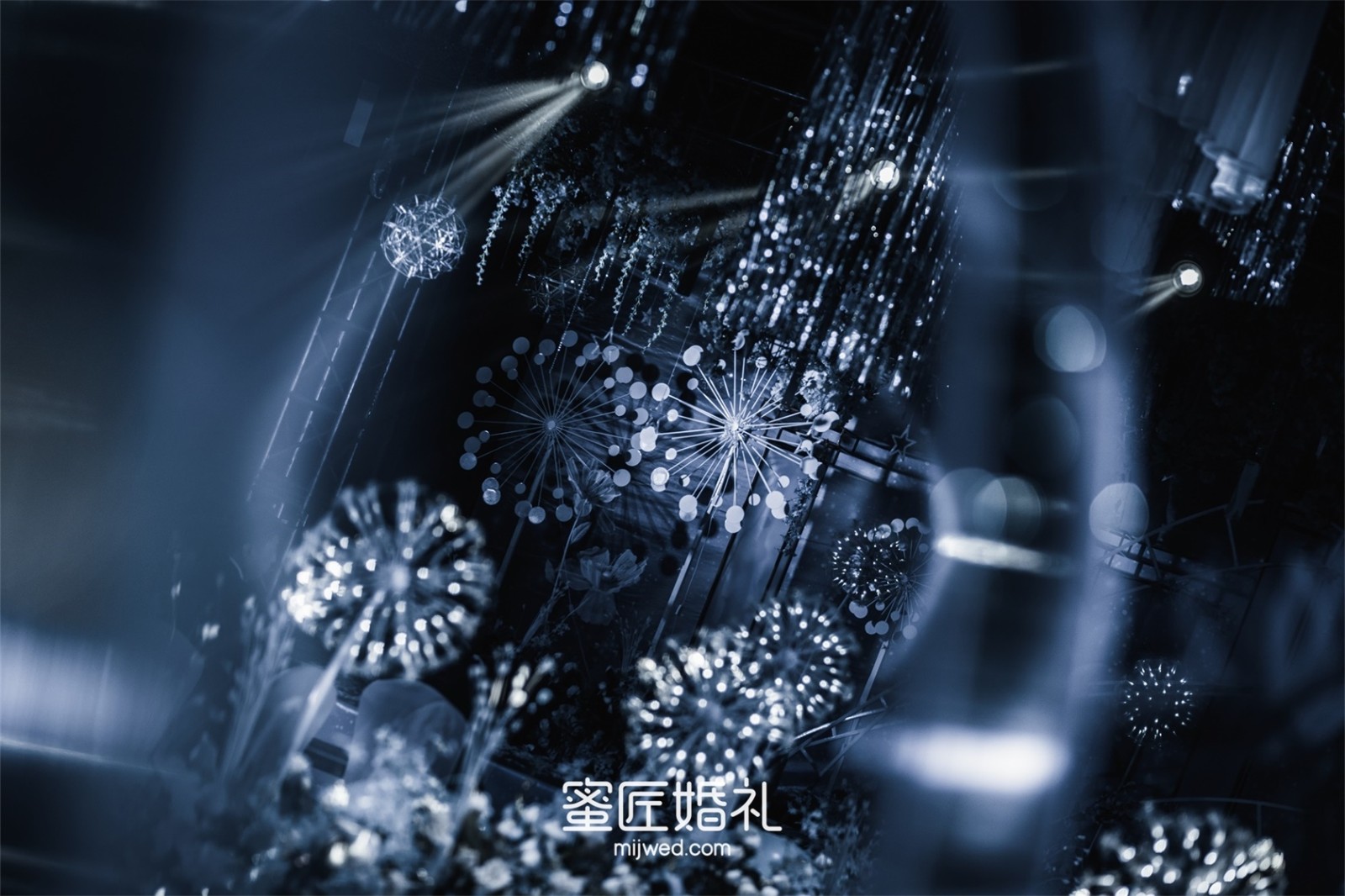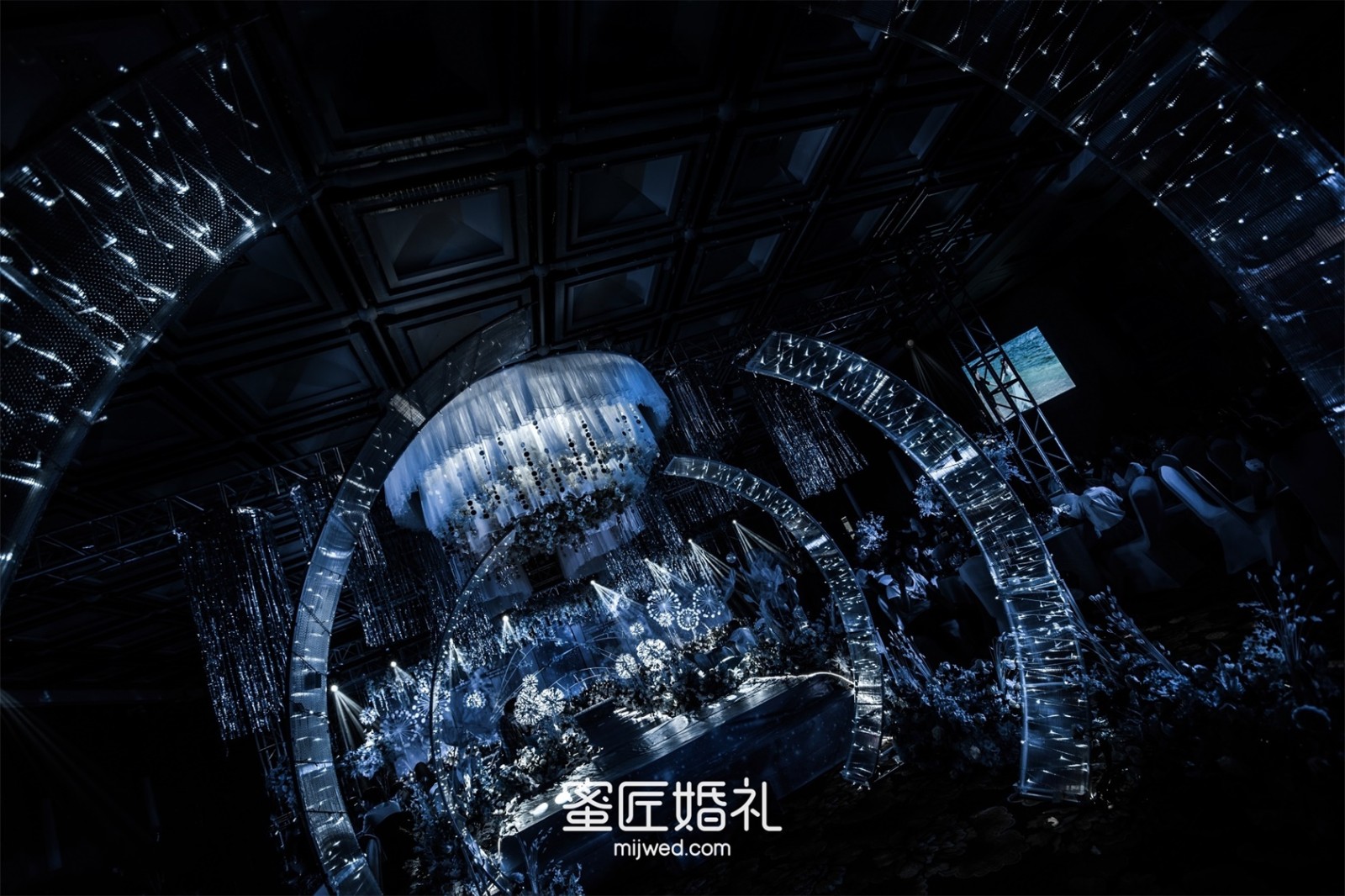 我的婚礼是在5月份,这时天气已经很热了,现场布置选择了梦幻凉爽的深海蓝色调,可以让宾客在炎热的天气一进入大厅,就感受到扑面而来的清凉和舒适,我希望我的宾客在婚礼中享受到惬意。