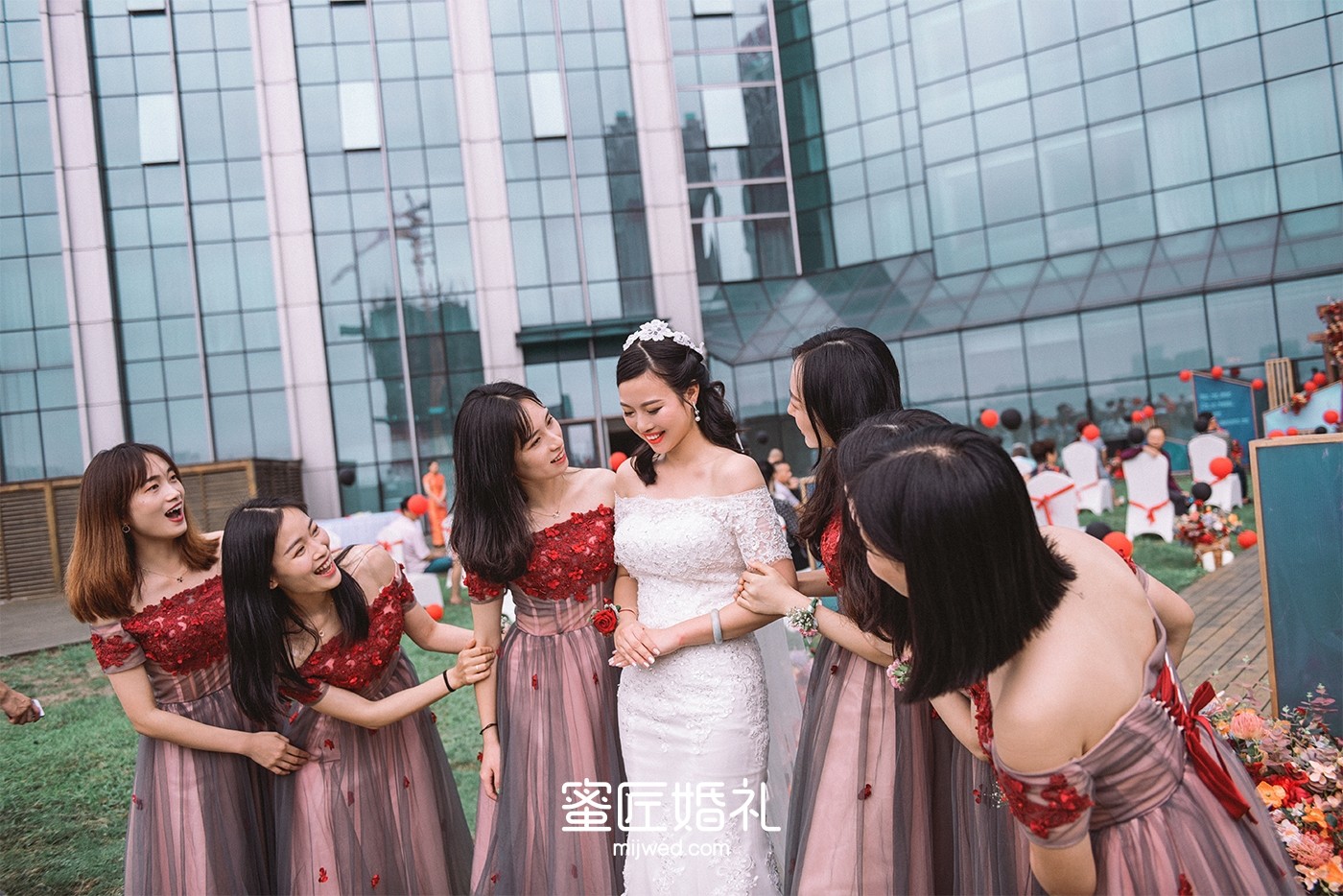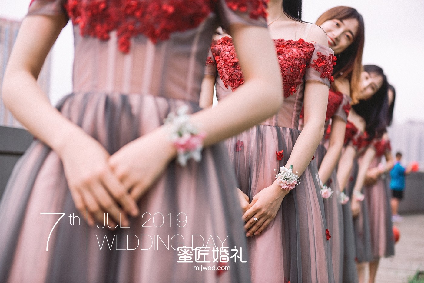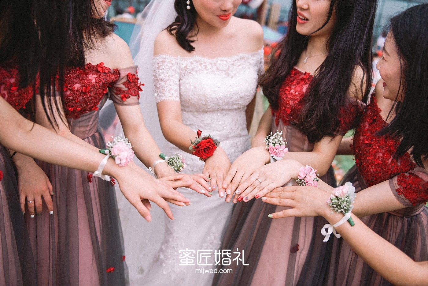 看惯了婚礼上千篇一律的伴娘礼服,所以这次闺蜜团的礼服我选了很多套,较后敲定了和婚礼主题颜色很搭的红色礼服,包括闺蜜团的手腕花我都是找人定制的干花,但是当天太匆忙了,婚礼上戴的是蜜匠提供的鲜花。
