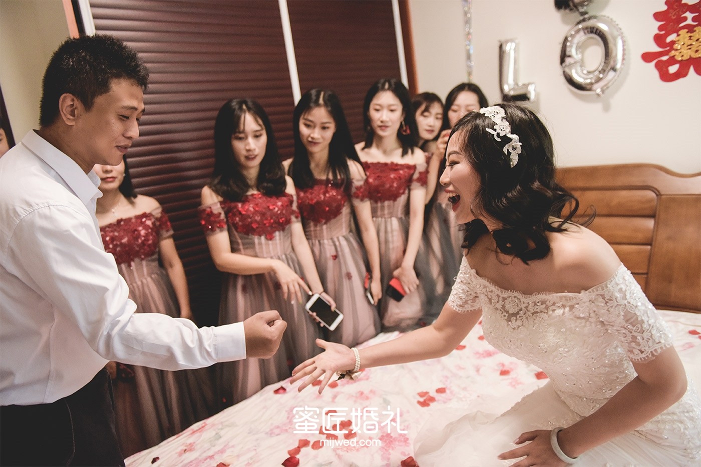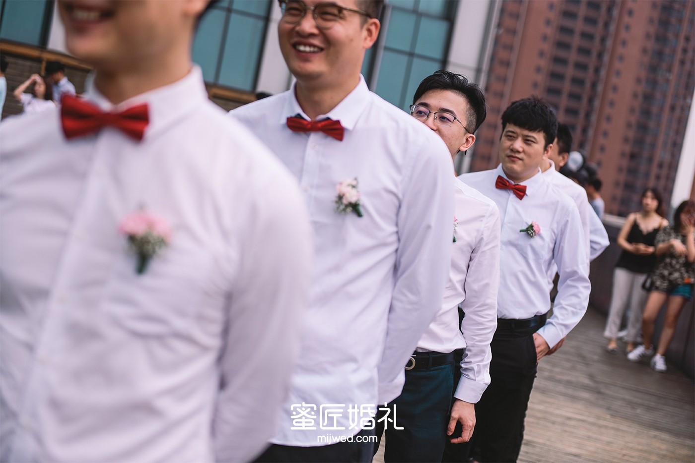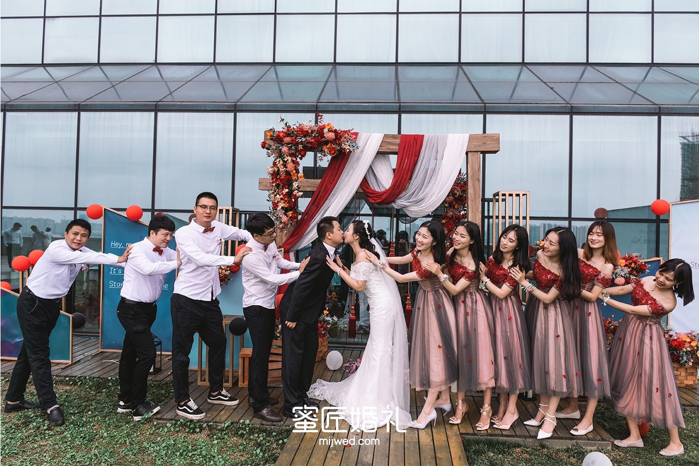看惯了婚礼上千篇一律的伴娘礼服,所以这次闺蜜团的礼服我选了很多套,较后敲定了和婚礼主题颜色很搭的红色礼服,包括闺蜜团的手腕花我都是找人定制的干花,但是当天太匆忙了,婚礼上戴的是蜜匠提供的鲜花。