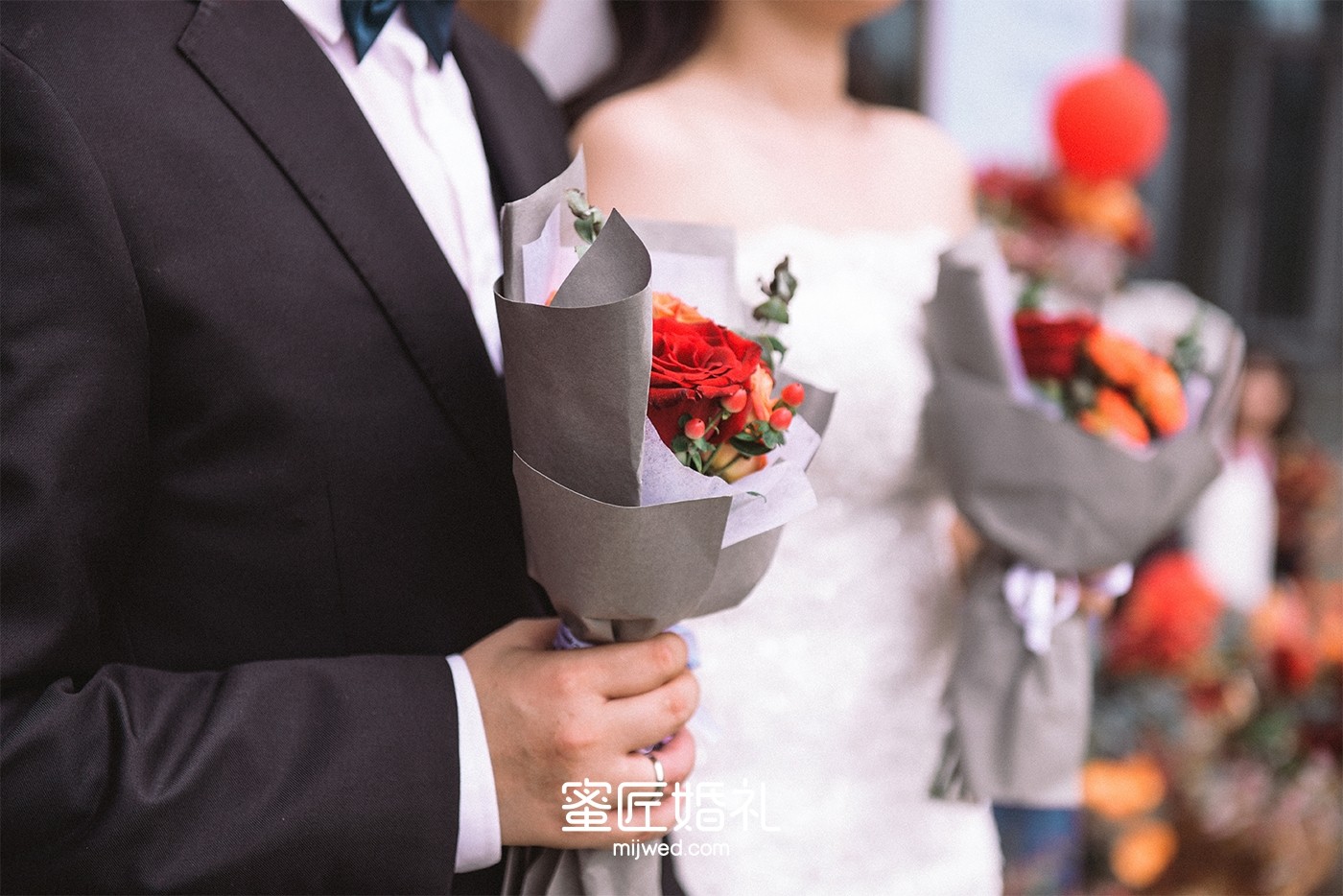 仪式上我的捧花是采用牵绳子的方式,一起有根绳子,但只有一根绑在了捧花上,当时我一个未婚的闺蜜扯到了那根绳子,我们认识快7年了,她很意外很幸运的拿到了我的捧花,当时她还没发表感言的时候,我们两个早已泣不成声。