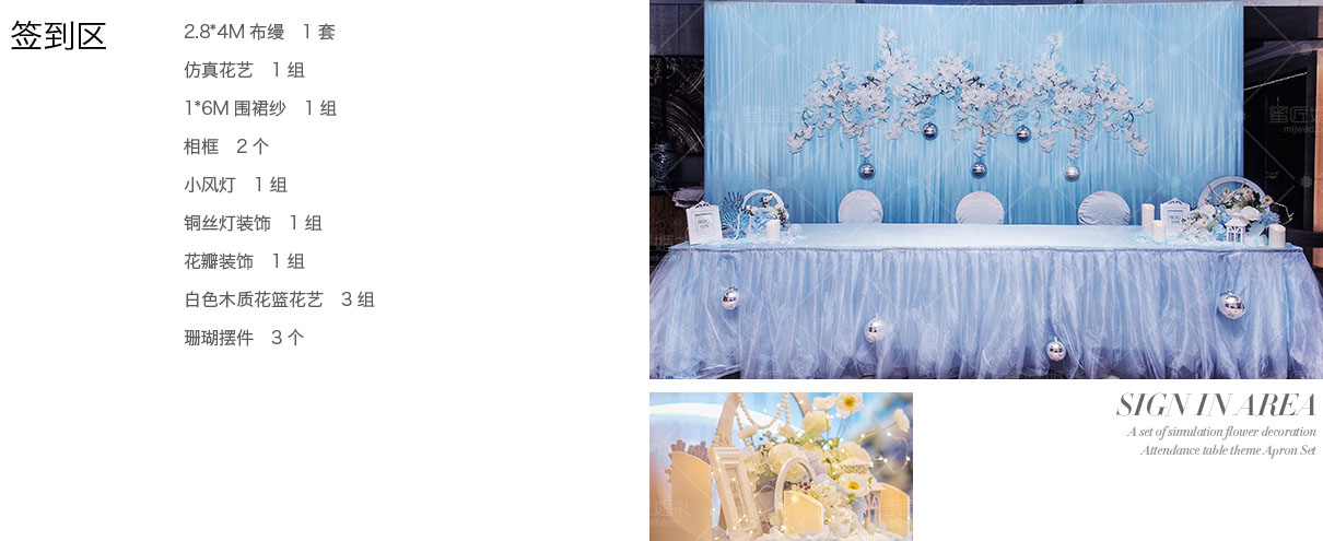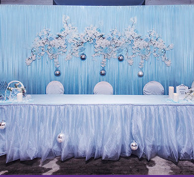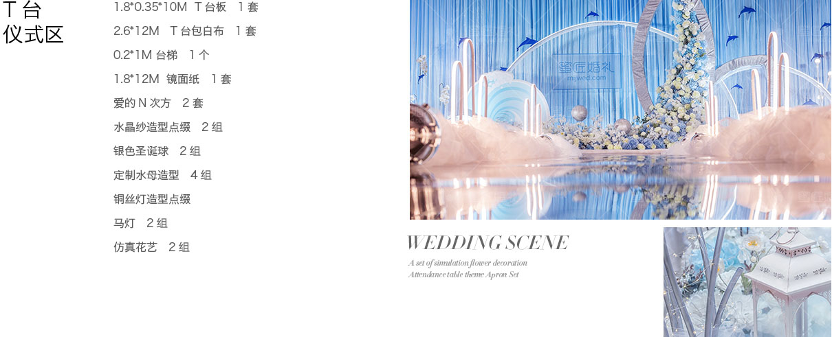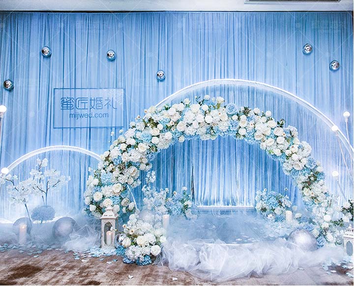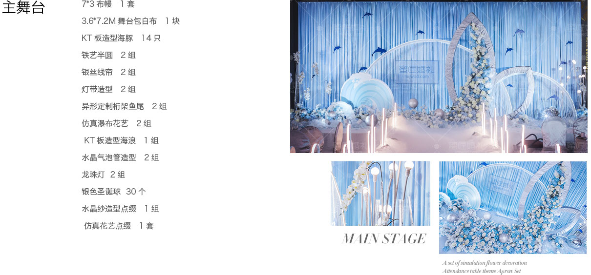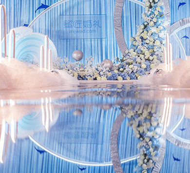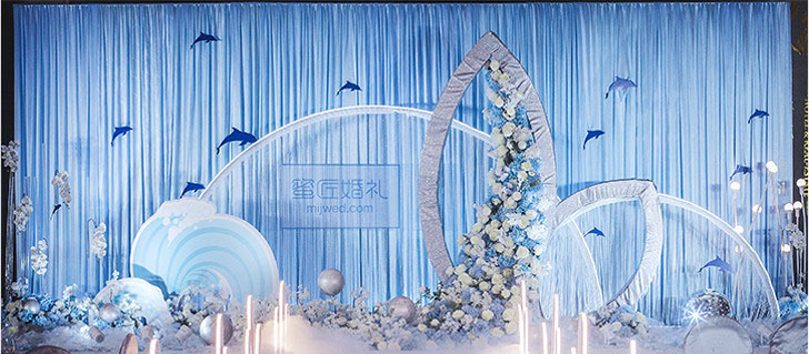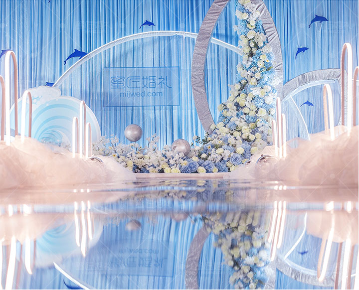 设计灵感源自南太平洋“阿达拉”人鱼传说,倾心打造定制桁架鱼尾融入婚礼,配合欢跃涌动的海豚与海浪,从美学和立体学展现空间存在感,模拟出美人鱼翻身入海的灵动意韵。设计师摒弃以往海洋风婚礼的浓墨重彩,以清新海洋蓝为主色调,搭配优选细闪银灰色系,将视觉效果铺延至海平面,既交织出柔和梦幻质感,又如浪花般波光伏动,熠熠闪耀,调配出自然舒爽的视觉体验。