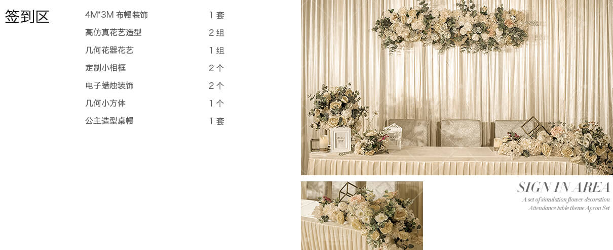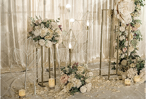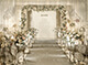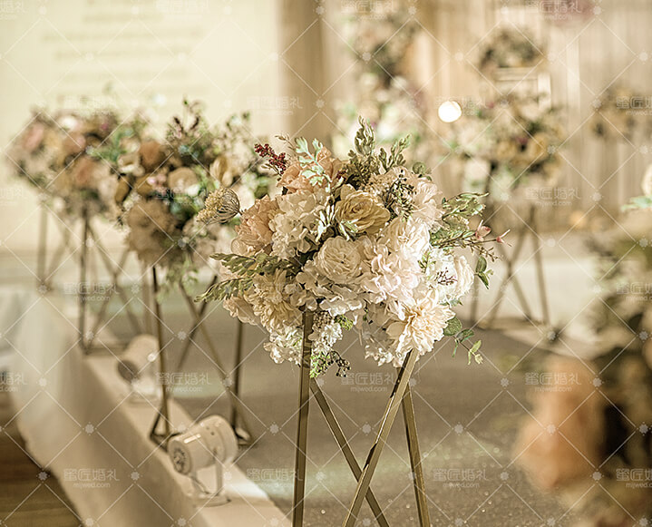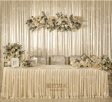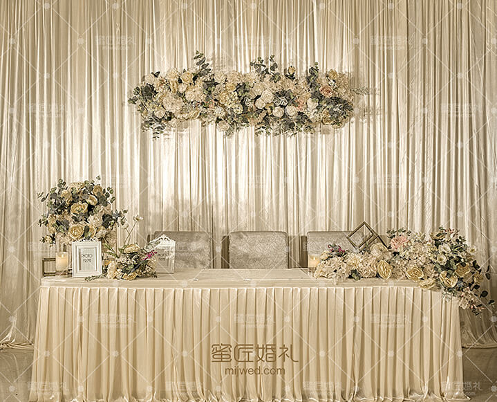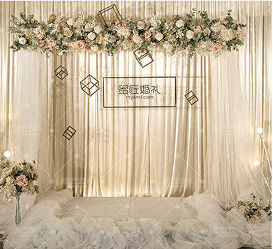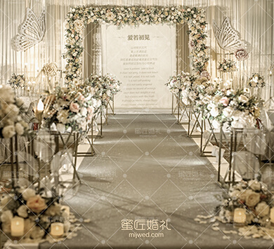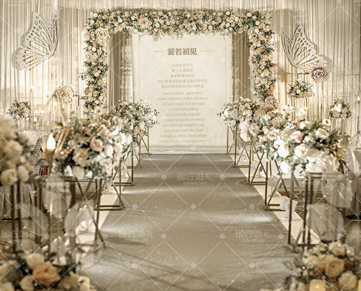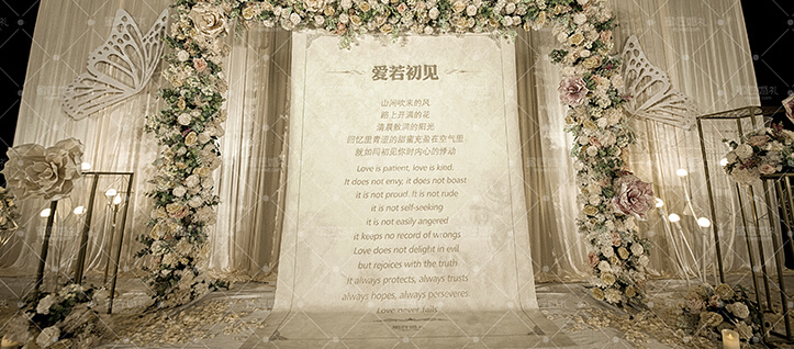 整体设计优雅清新,极具法式风情,精心优选的奶油香槟色背景布幔,如丝质般柔滑。浅绯与灰绿的花艺配色,淡素怡人。上千枝高仿真鲜花编织成的浪漫花门,见证你们四手相牵的甜蜜;翩然而至的巨型蝴蝶装饰,在旁静静倾听你们许下的承诺;主背景为一副中世纪复古风的油画卷轴,上面铭刻了你们爱的誓言。