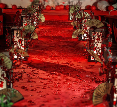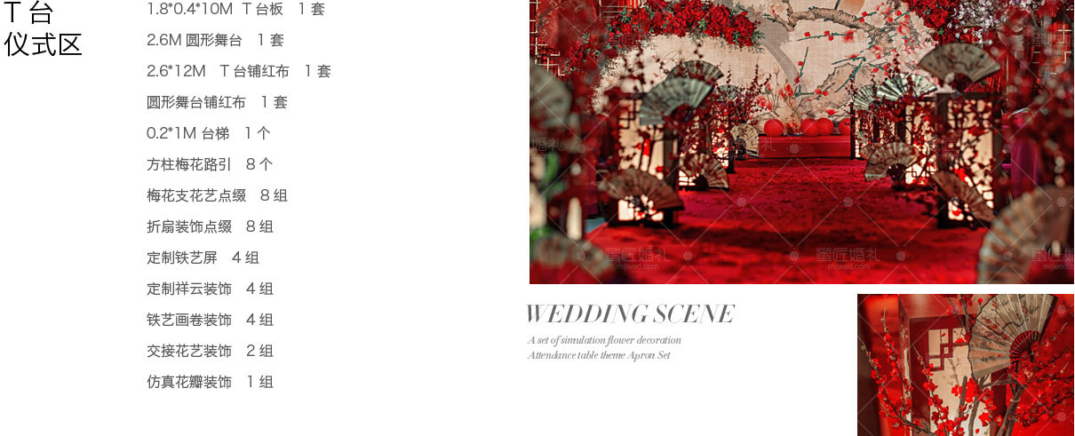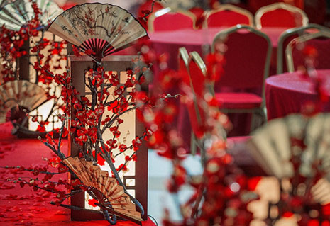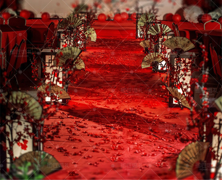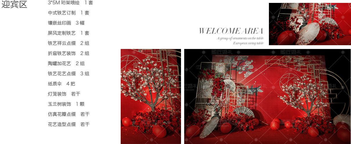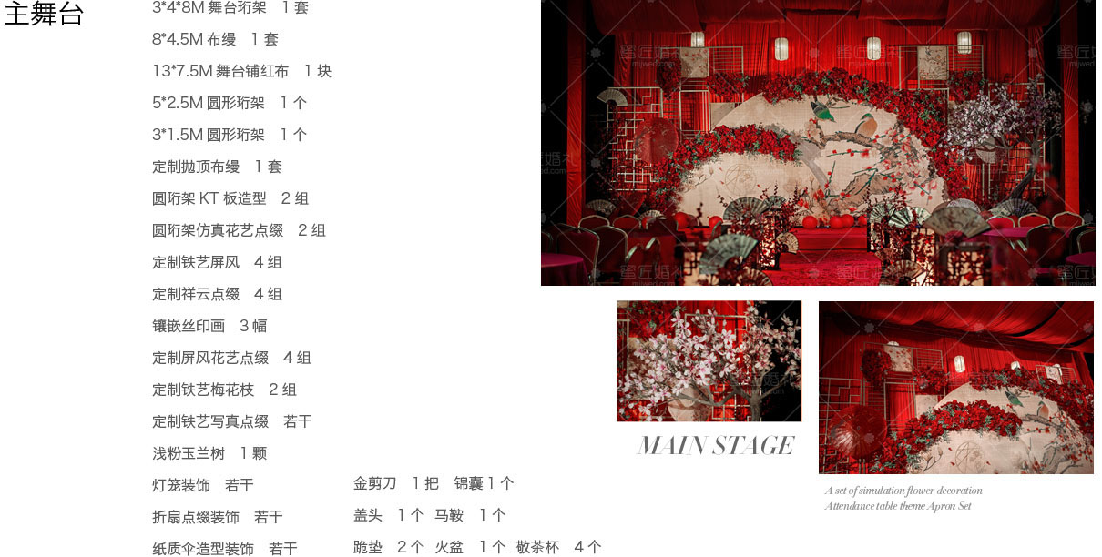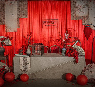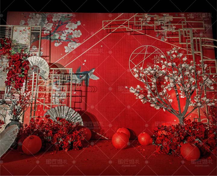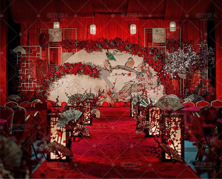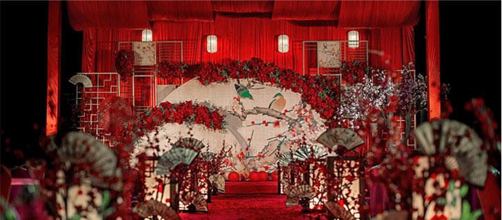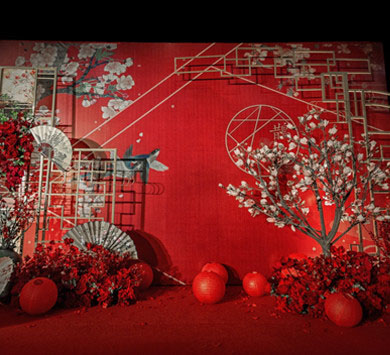 灵感源于以鹊报喜,互诉情长的中式浪漫,柔情似水,佳期如梦,忍顾鹊桥归路。整场婚礼以中国红为主,金色、喜鹊登梅图等元素融入其中,将浓浓的中式风情演绎的活色生香。听到“鹊”声,就预示着家里有喜事来临,把“悦”分开,即“用心兑现爱的承诺”,这样温婉绵长的爱情,又岂在朝朝暮暮。