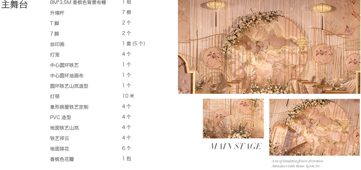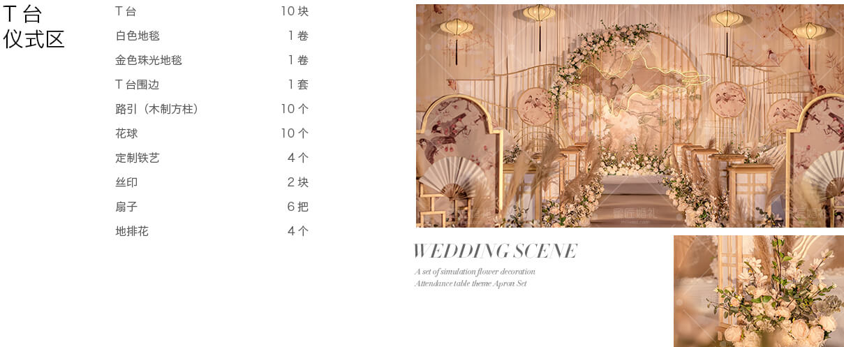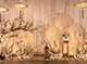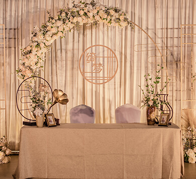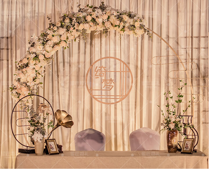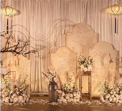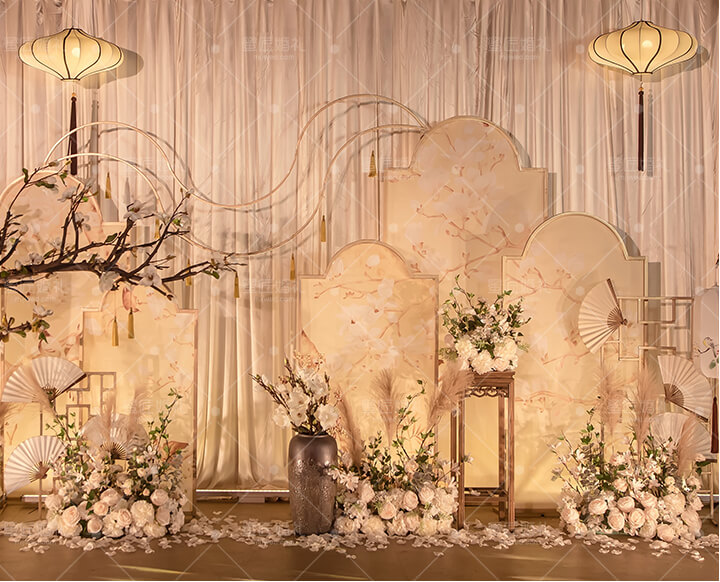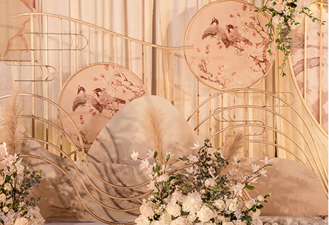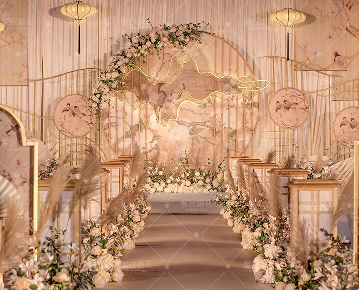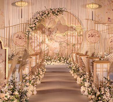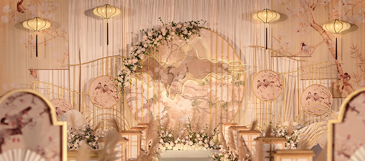 抛却传统的中国大红风格,古朴素雅的色调与有着中国传统元素相辅相成的新中式风格,象形山岚造型、建筑风格的屏风设计、摇曳生姿的芦苇花艺,带你走进一个充满中式情怀的东方绮梦。