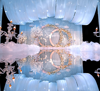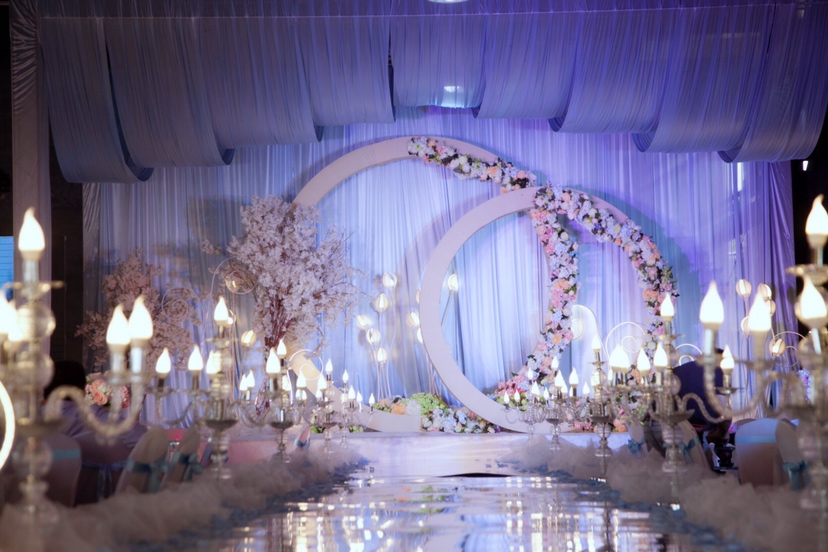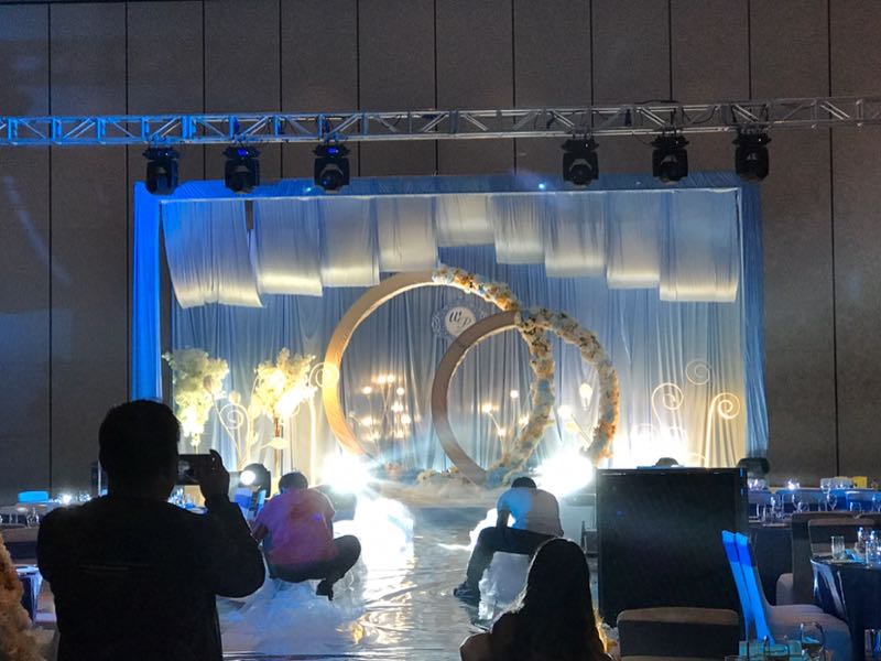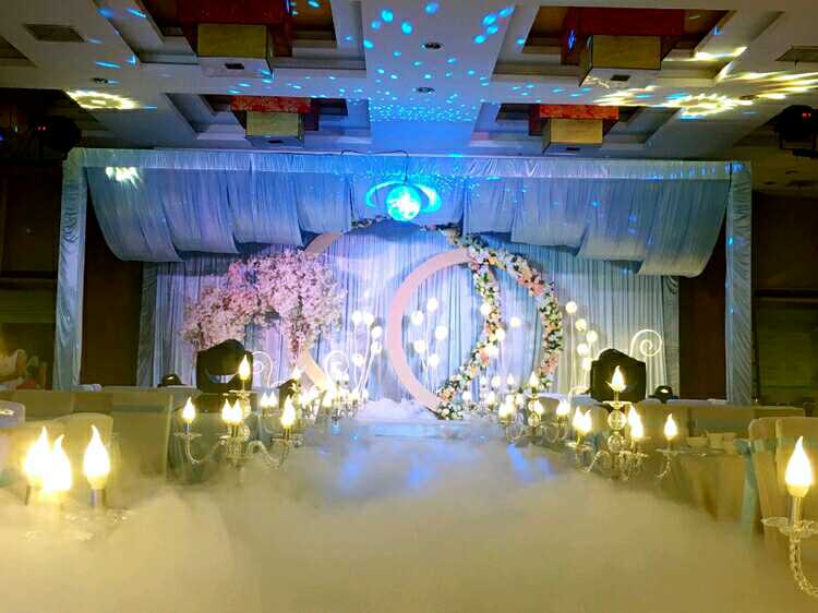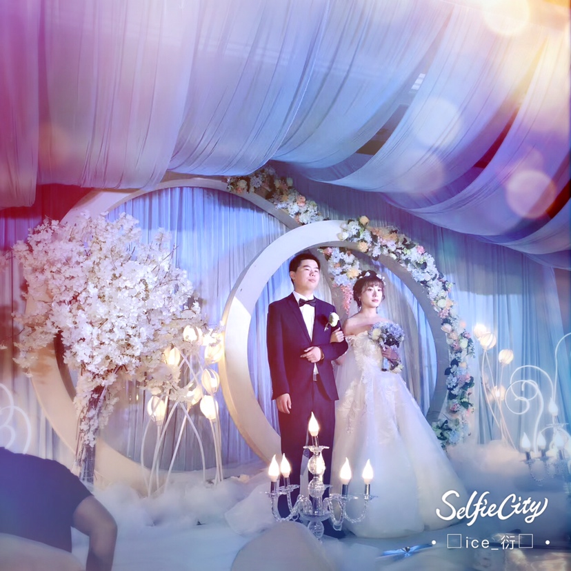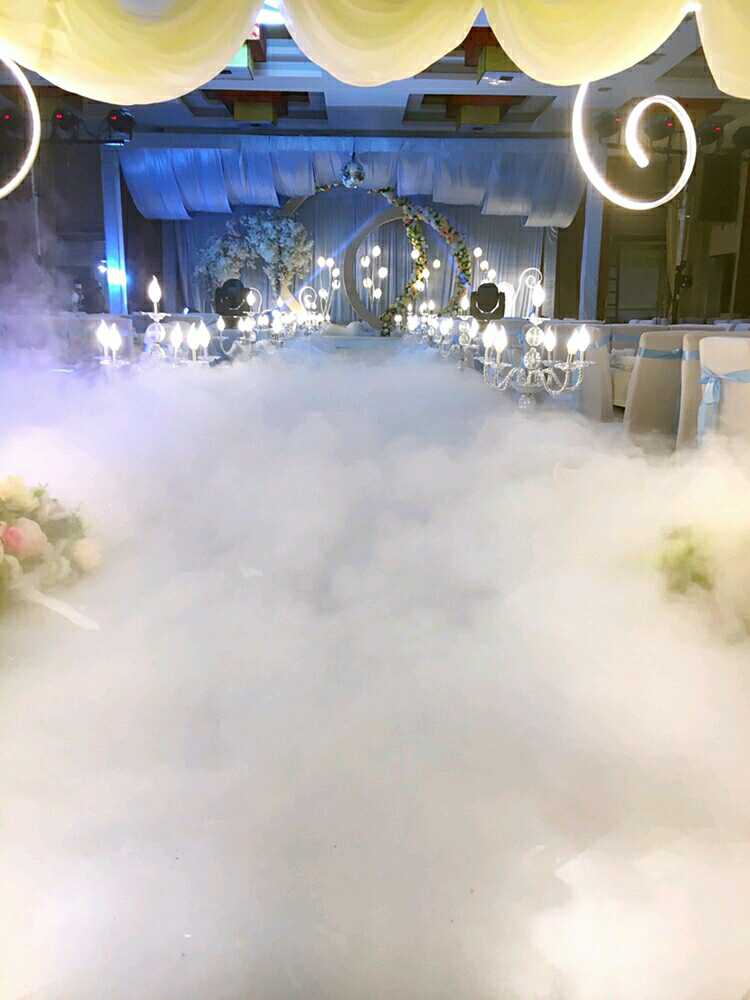 很梦幻的婚礼现场,原本舞台搭起来的时候看着没什么感觉,结果婚礼当天灯光,干冰结合在一起后,现场真的美呆了(真香)。