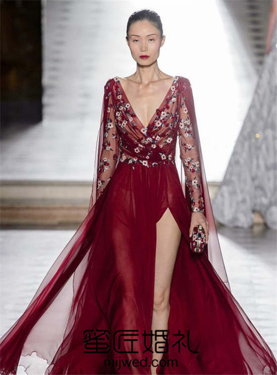 如果你喜欢的是喜气的红色,这件红色刺绣礼服一定不要错过,红色虽然艳丽但又不妖媚,深V和侧开衩的设计使红色礼服少了两分沉重感,多了一分性感魅力