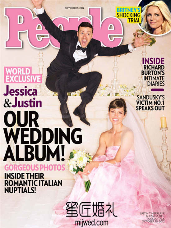 2012年10月19日,杰西卡-贝尔和歌手贾斯汀-汀布莱克的婚礼也在当年备受瞩目,很大一部分原因就是因为新娘出其不意的选择了一款粉红色的婚纱。这件婚纱是专门为杰西卡-贝尔定制的,售价在10W美金左右。