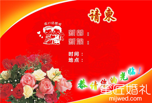 正文:要写清活动内容,(囍结婚请柬地写法)如开座谈会、联欢晚会、生日派对、国庆宴会、婚礼、寿诞等。写明时间、地点、方式。如果是请人看戏或其它表演还应将入场券附上。若有其它要求也需注明,如“请准备发言”、“请准备节目”等。