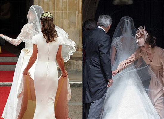 7.新郎进门前,伴娘为新娘整理装束的过程,重点特写用手整理头饰和婚纱的过程;