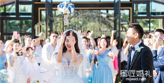 新娘背对来宾将幸福的花球抛向台下的兄弟姐妹,新郎负责倒数。