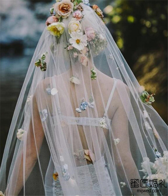 轻巧透气的透明硬纱制成的花朵,组合成奢华的波西米亚风长款面纱。这里不再将面纱仅仅当作面纱,而是作为整个造型的核心亮点。