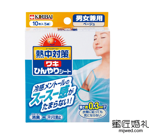 夏天是较容易“湿身”的季节了,尤其是爱出汗准新娘,只要在室外走上几分钟,婚礼一天下来也分分钟破功,默默心疼准新娘三秒。不过,这也不是一道无解题,只要花点心思,也可以照美不误。比如腋下冰贴就“专治”汗渍,贴在衣服内侧,悄悄吸走汗水,婚纱上什么也看不出来了, 假装一点都不热。降温贴里面有两种冷感成分,凉感很强,贴上之后短时间内基本不出什么汗,而且吸汗能力超强,就算腋下有积汗,礼服上也不会出现“小地图”。