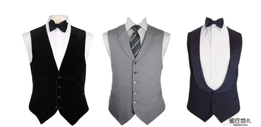 3.马甲:为衬衫配上一个马甲,这样会让新郎着装显得更加正式。马甲的颜色不要太厚重,浅色系的更好一些。穿一件全身的马甲,再配上一条漂亮的领带或者领结,会让新郎显得气质非凡。如果你不属于时尚先锋,就用我们较喜欢推荐的颜色吧—黑色。谨记:马夹,宽腰带一定要遮住你的吊裤带。