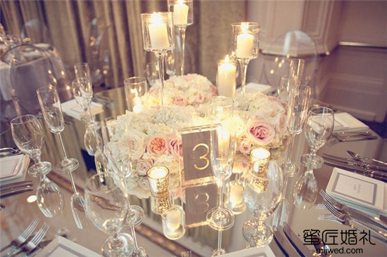 蜡烛:牢记虽然锥形的蜡烛在视觉上非常生动,但是烛泪很容易滑落。具有强烈装饰效果的彩色玻璃蜡杯与鲜花搭配使用,外加亚麻质地的桌布,能为你的餐桌增添亮色,营造完美视觉效果。带电池的锥形、枝状、小型蜡烛虽然亮度不如真正的烛光,价钱也比普通蜡烛昂贵,但在禁燃明火的宴会场地,只有它们能发挥作用。