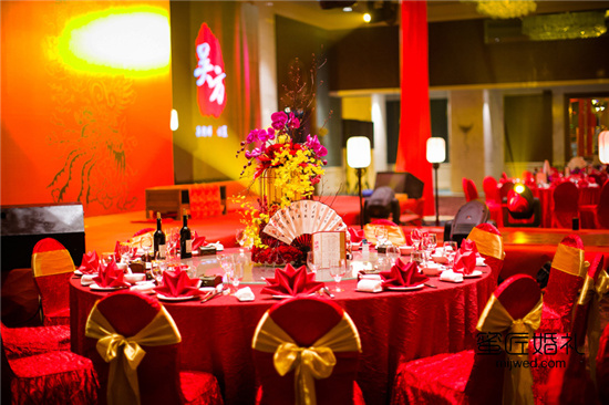 如果您喜欢中式婚礼,那么结婚少肯定不了红色。把红色用在餐桌布置上,可以进行改良设计。比如:采用局部的红色,以配合整体环境,做出有创意中式风格。