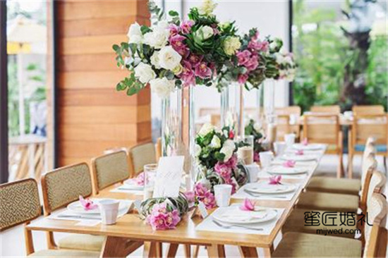 很多新人结婚时候以为只要把舞台、签到台等布置好就行了。其实一场婚礼整体是不能少了婚宴餐桌布置的。毕竟亲朋好友都会要就座吃饭,一场婚礼够不够精致就在于婚宴餐桌布置。