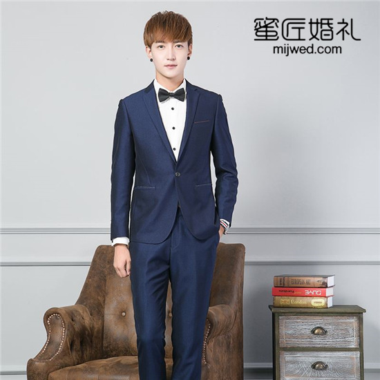 天然的哑麻材质让黑色中显露出温和的气质,偏窄的版型把睿智精明的形象营造出来,是喜好简约的准新郎的首选。