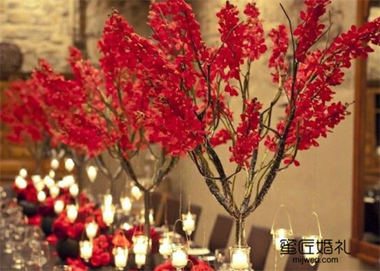 其实很简单,可以在花型的选择上下点功夫。说起红色的花卉你的较好反应应该是玫瑰花吧,虽然集“浪漫、甜蜜”于一身但是确实有些俗套了,所以你可以选择而一些比较新鲜的花。像是梅花就是可选之一,无论是从花的品格还是造型都非常的富有新奇感。