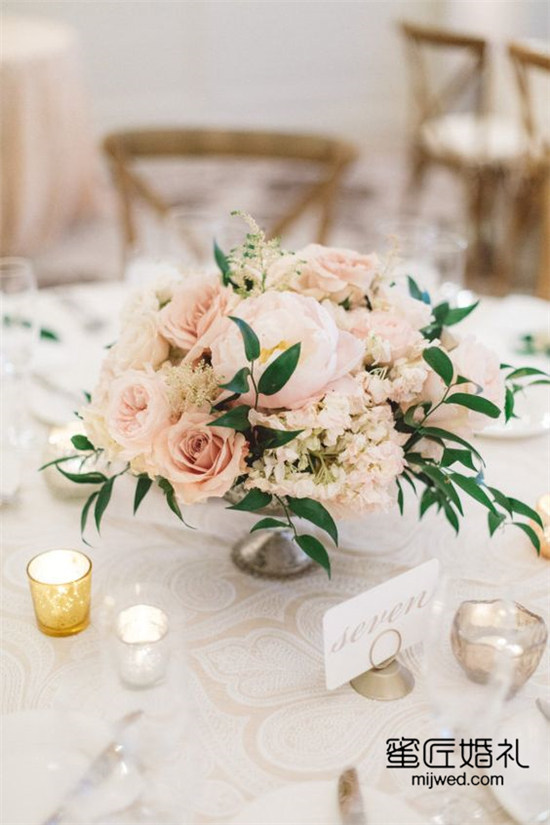 很多新人的婚礼通常比较的甜美,给人一种浪漫甜蜜的小女人氛围,所以对于这类主题都是以粉红色系作为颜色主打色系的。所以在桌花的选择上一定是选择颜色粉嫩一些的桃红色,千万不要搭配撞色系列,这样会让整体看上去很混乱。既然选用了粉红色系的花卉装饰,那么在插花时一定要保证花卉的饱满度,制作成一个饱满的花球状看上去才会漂亮。