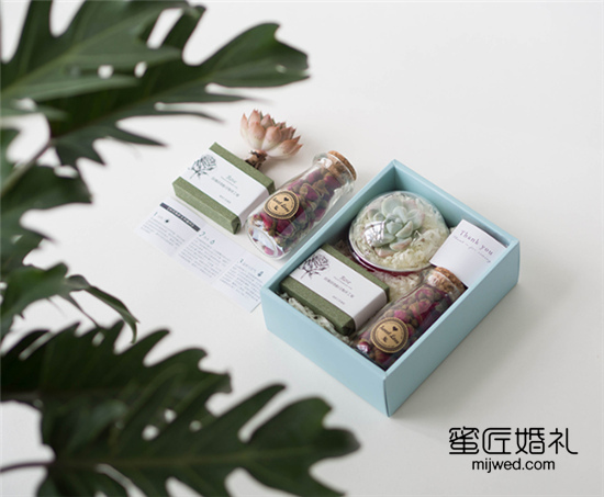 现在很流行送伴手礼代替结婚礼盒,新人们可以采用多肉,手工皂,玫瑰糖等组成好看又实用的回礼赠送给来宾。