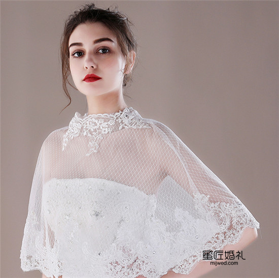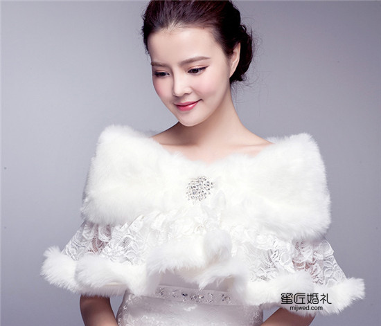 斗篷式的毛绒披肩,是秋冬季节穿抹胸婚纱的首选。经典还百搭,这种蕾丝花边让整个婚纱礼服是一体的,尽显新娘温婉甜蜜气质。波浪毛边加上钻石扣,档次十足。