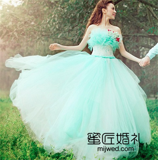 绿色婚纱代表着安全,平静,舒适。绿色往往被诠释为生命以及大自然的象征。给人重生的全新感觉。而以绿色为主的婚纱则很好的体现了这些特点。穿上它立即充满生命力的活力之感,自由向上,无拘无束,仿佛驰骋于大自然之中。
