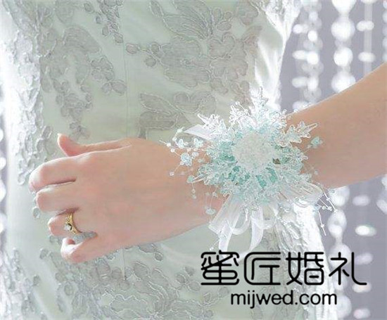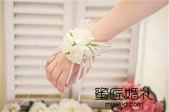 新娘手腕花是在迎亲的时候,由新郎为新娘佩戴在左手腕,与佩戴婚戒的手一致。而且如果新娘戴了新娘手腕花的花那就不要再戴手链了,身上的装饰不宜多,要精致简洁,这样才能出彩。