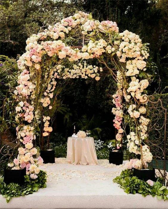 铁艺婚礼仪式亭:除了藤条和木材,铁艺的布置充满了浓郁的欧式文艺气息,同时也可再循环利用,环保低碳。将普通的高挑酒店大厅打造成了英国皇室殿堂,立刻让人联想到了英国王妃,较贵至极,当新娘与新郎站在仪式厅下面宣誓,这画面估计要打动无数宾客的芳心了。