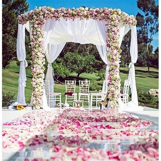 方形鲜花修饰纱幔四角亭:在方形四角亭上面加上了鲜花修饰,加上纱幔、LED灯带,再配上漂亮的路引,在婚宴酒店里有种梦幻感,仿佛置身花海丛中。