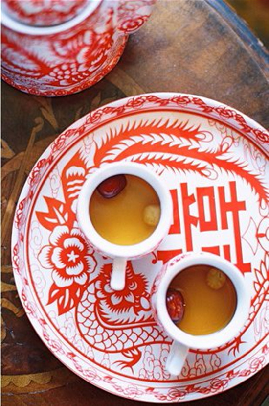 而且现场的喜茶也是需要特别准备的。婚礼敬茶礼仪的喜茶需要放入莲子和红枣,这样才更有寓意。其中莲子不要切开,必须是完整的,因为切开两半就有分开的意思,会显得不吉利,而红枣代表鸿运当头,也非常适合婚礼氛围。喜茶怎么喝?放入的红枣一定不能是去核的,因为核即种子,代表子孙,所以对于想要开枝散叶早生贵子的长辈们来说会比较注重这些。