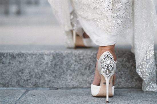 说到婚鞋的颜色似乎没啥可讨论的,很多人都选择了一红一白,红色用来搭配敬酒服,白色则用来搭配婚纱。其实与婚纱搭配的婚鞋,在颜色的选择上还有更多可能,金色、银色、米白、裸色以及淡粉都是可以的,重要的是在选择之前要结合婚纱设计,选择出搭配较和谐的那一双。另外还有一个选择标准是日后能不能再穿,如果能搭配婚纱的同时在日后还有用武之地,无疑是较好的结果。