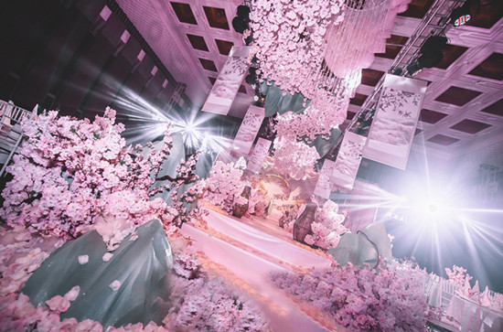 仙鹤翔于九州,风起,桃花漫天,弦动,琴音绕梁。在十里桃林深处,新人共结连理。设计师将婚礼现场打造成桃林仙境的样子,主舞台随阶梯而上,两只仙鹤于桃林之间振翅飞鸣,互诉衷情。一幅幅卷轴自空中垂下,使婚礼现场更加充实。迎宾处一张古筝立于门前,清酒已温,待与君尝。整场婚礼的搭建都透着侠骨柔情,浪漫深情。我许你三生情缘,盼你共我三世婚礼。