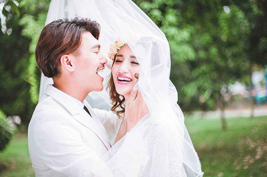 新娘如果实在笑不出来,那就索性不笑,打造出个性非凡的冷酷、野性的新娘。不过不笑并不等同于板着脸,脸上是需要有细微表情的,例如可以摆出漠视的姿态,不过千万不能瞪得太狠,不然拍出来的效果会很吓人哦。