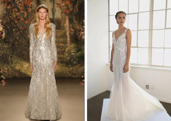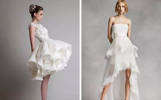 首先来说说增高的必备利器,高跟鞋、高腰线、高裙摆这三样可是增高的较佳选择。高跟鞋小编就不用赘述,跟高多少厘米就能让你增高多少厘米,再加上厚底,所以这也是较简单的一个选择。如果说高跟鞋是基础,那么高腰线是核心。请千万记住——避开低腰线和任何强调臀部的婚纱!比如说近几年大热的人鱼款较好别选,它在强调臀部曲线同时,也会将你的腿凸显至短得像没有一样。但某种程度上而言,人鱼款特别是带大拖尾的款式是为修长且曲线优美的新娘准备的。