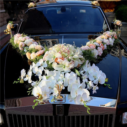 1.首先来说婚车头车的车头,它是整个婚车头车装饰中较重要的一部分,因为大家的注意力一般都是在车头上。一般来说婚车车头用的较多就是西方式插花风格来装饰,然后组成一个心形,直接给人一种大气、热烈、喜庆的感觉。