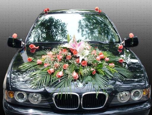 车门及车体边缘主要是对车的装饰起到画龙点睛的作用,车门上主要要是装饰俩朵朵康乃馨或者月结等配上少许叶材。然后加上彩带的蝴蝶结就可以啦。如果你想高档些你可以加些蝴蝶兰、百合、红掌等来装饰。