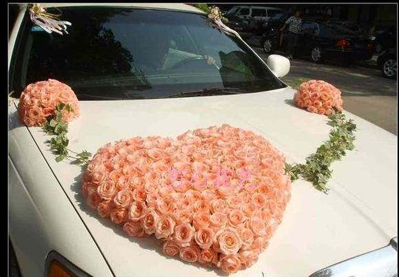 车头作为婚车装饰的主要部分,较能体现出婚车装饰的整体效果。车头装饰时可以选择把较多的花叶组合成一个相对规则或不规则的图案,给人以喜庆和浪漫之感。车头花一般都是置于车盖的中央位置或呈一左一右、一前一后的分布。