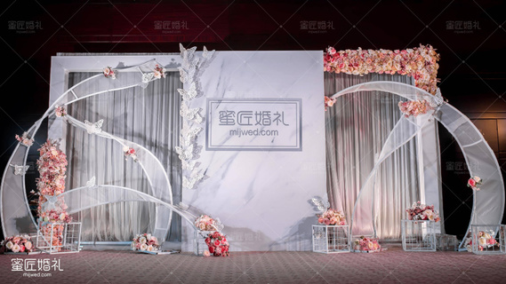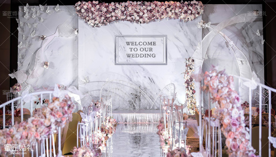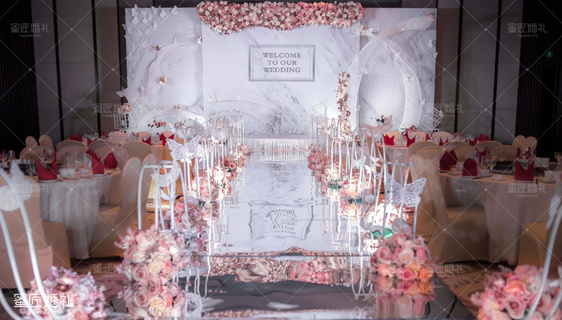 由白色营造出晨雾的朦胧感,不仅给来宾一种神秘感,还有着清晨的一股清香,大理石纹路是现场高端奢华的保证,铁艺灵蝶让这清晨的雾有了生命感。再利用粉红色的花艺对现场进行布置,整个婚礼现场就是花间晨雾的感觉了。啊!这该死的无处安放的魅力啊!
