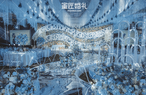 既然是蓝色婚礼,主舞台一起所有婚礼现场都是以蓝色为主色调的,蓝色属于浅色系的一种,而浅色系同样也需要浅色系的颜色来搭配,比如说白色或者粉红色都是可以搭配蓝色的不错的颜色,只是粉红色营造出来的是一种甜蜜温馨的感觉,而白色将蓝色的纯净发挥到极致,这里介绍的也就是白色作为搭配色的策划了。主舞台采用大面积的悬挂丝线的吊顶,让整个婚礼现场显得大气,然后用蓝色与白色花艺作为主舞台的背景板,让现场显得温馨而浪漫。