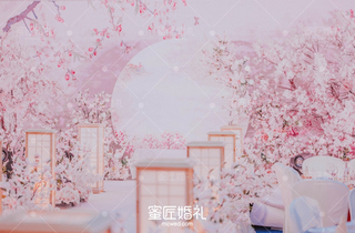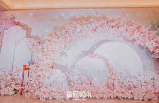 粉色主题也是要通过景物来体现的,这里的景物就是浪漫的粉色桃林了,在婚礼主舞台,我们采用位置对称的桃树对主舞台进行基本的布置。接下来就是背景板了,背景板刻画上桃树枝并且画上皎洁的月亮,让舞台整体呈现出纯洁的浪漫感。主舞台采用粉红地毯进行铺垫,这样一来,婚礼现场的主舞台就布置完成啦,而且甜蜜又幸福的感觉可是丝毫不减哦!