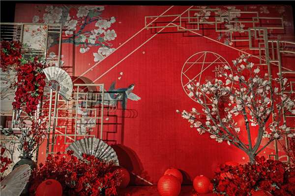 郑州红色婚礼主舞台主要是以喜鹊登梅图作为主要场景,至于主色调,那当然就是红色的了,这样中式浪漫的场景一定能够引起新人与来宾的共鸣。然后再在婚礼主舞台两旁布置上玉兰花树,让整个婚礼现场显得清新雅致。再在背景板上布置一些中国特色的红色油纸伞整个郑州红色的婚礼主舞台大概就布置完成啦,是不是非常浪漫而喜庆呢?