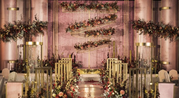 主舞台:选用赤橙调的暖意与气质奶茶色,相互碰撞,既有几何造型空间层次, 也有琥珀色烛灯光影婆娑,渐变的缤纷色彩,满满的浪漫气息。