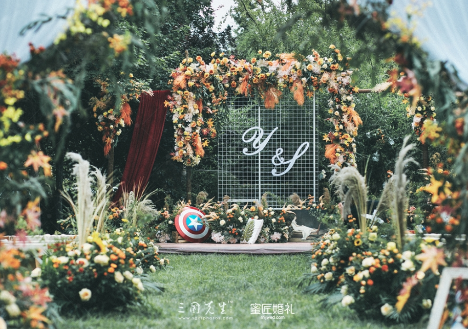 彩色的鲜花和绿色的植物搭配在一起,特别适合户外婚礼主题,超人元素的加入,你就是我心中的英雄。
