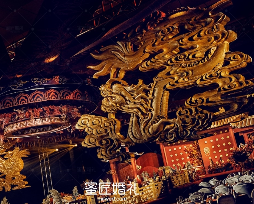 这款婚礼主题整体也是中式的风格,同是还具有满满的宫廷风,真的非常大气了。主舞台布置有古代皇家感觉的宫门,还有红色祥云雕刻和龙的装饰,整体风格恢弘大气,如果喜欢宫廷感觉的话,这个真的是不错选择。