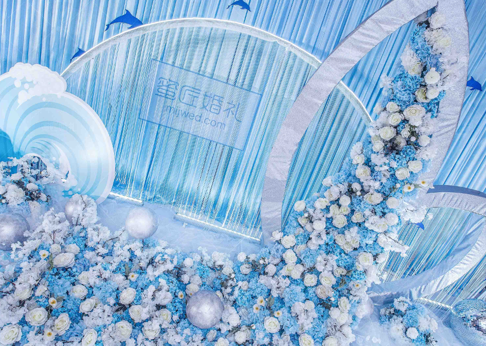 灵感源自南太平洋“阿达拉”人鱼传说,以清新海洋蓝为主色调,定制桁架鱼尾配合欢悦涌动的海豚与海浪,辅以星星点点银色球饰点缀其中,银光微闪,花架灵动,呈现自然舒爽的视觉体验。