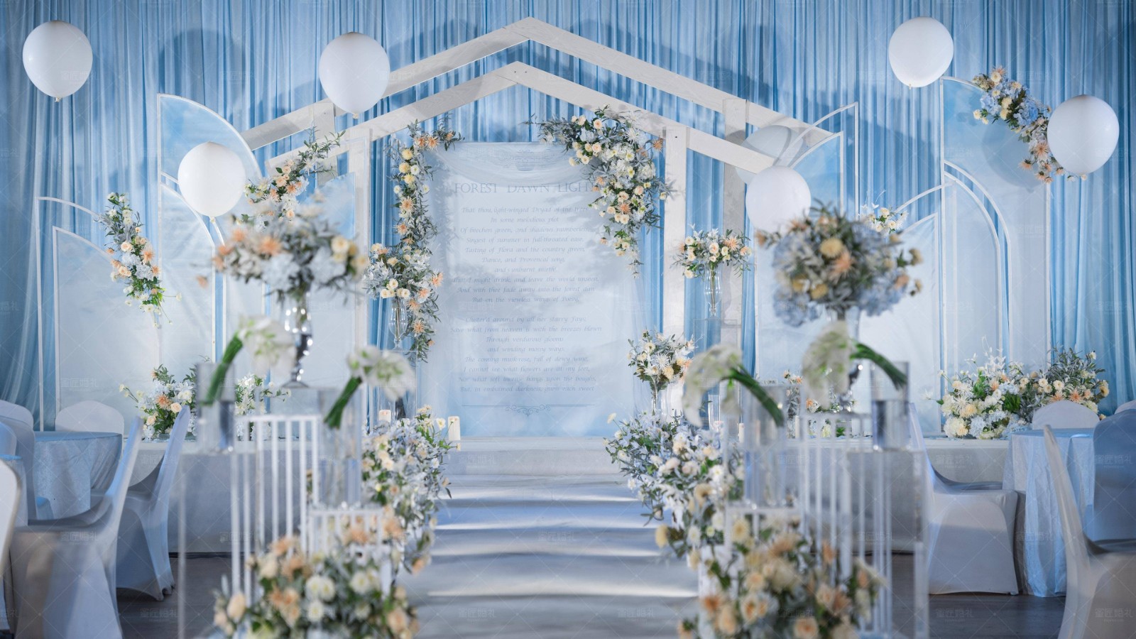 几何框架与半透纱质画布打造家的感觉,黄金视角处两三簇花艺更添静谧美好,轻盈精巧的花艺在通透的水晶柱上静静盛开。时光深处,惊鸿一瞥,晨曦的轻盈与浪漫,以天空蓝为基调,用自然的笔触,层层晕染,剪切出几何画布的景致,搭配灰绿与浅橙的花艺,适度的优雅和俏皮。
